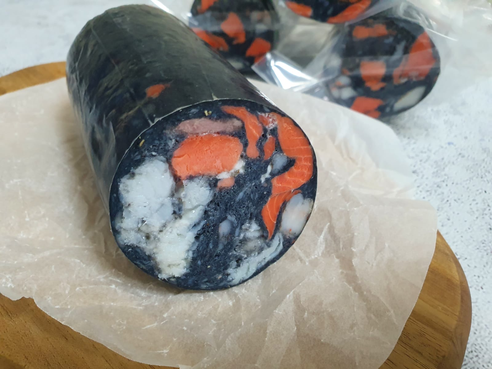 Вкус. Эта колбаса обладает мягким, но насыщенным вкусом, благодаря сочетанию филе конгрио, нерки, кижуча и креветок. Варено-копченая колбаса из конгрио, нерки, кижуча и креветок с чернилами каракатицы – это изысканный деликатес, созданный из премиальных ингредиентов. Филе глубоководного конгрио обеспечивает мягкость и сочность, а красная рыба (нерка и кижуч) добавляет нотку благородства и насыщенности вкуса. Добавление креветок делает продукт особенно привлекательным для любителей морепродуктов, придавая ему легкий сладковатый оттенок. Чернила каракатицы создают уникальный темный оттенок и придают характерный морской аромат.