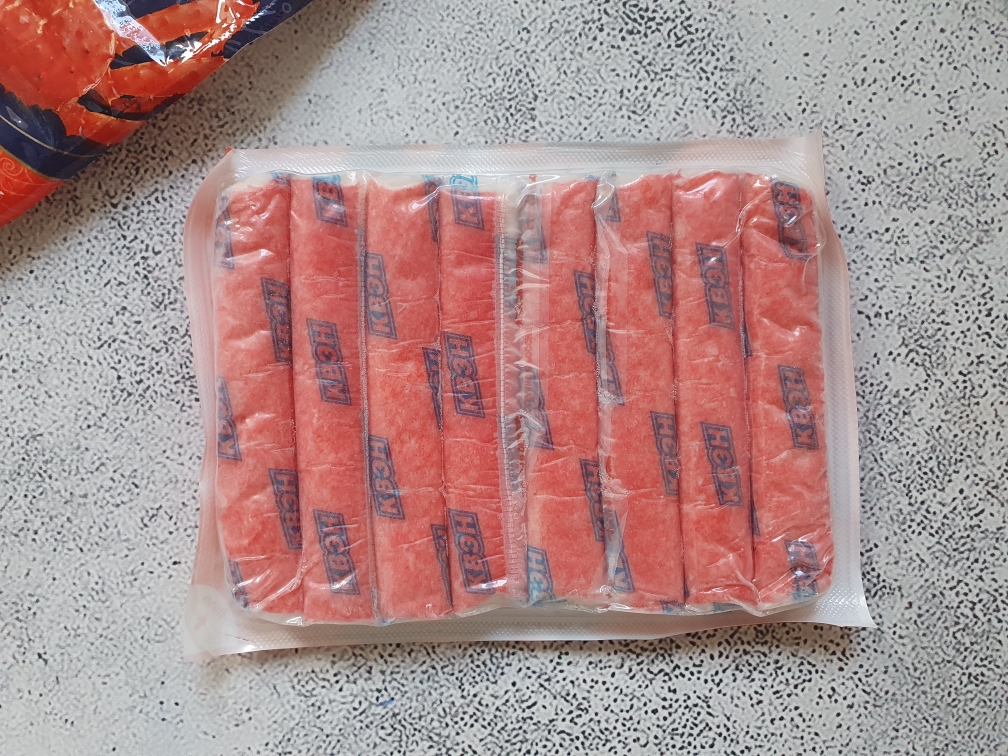Состав: Фарш “Сурими” из минтая; вода; крахмал картофельный; соевый белок; яичный порошок; подсластитель – сорбит; пищевые волокна; стабилизаторы – каррагинан, фосфаты, соль, масло растительное, ароматизатор крабовый натуральный, усилитель вкуса и аромата “Глуринат”, сахар, мясо краба натуральное, красители – кармин, паприка, диоксид титана.