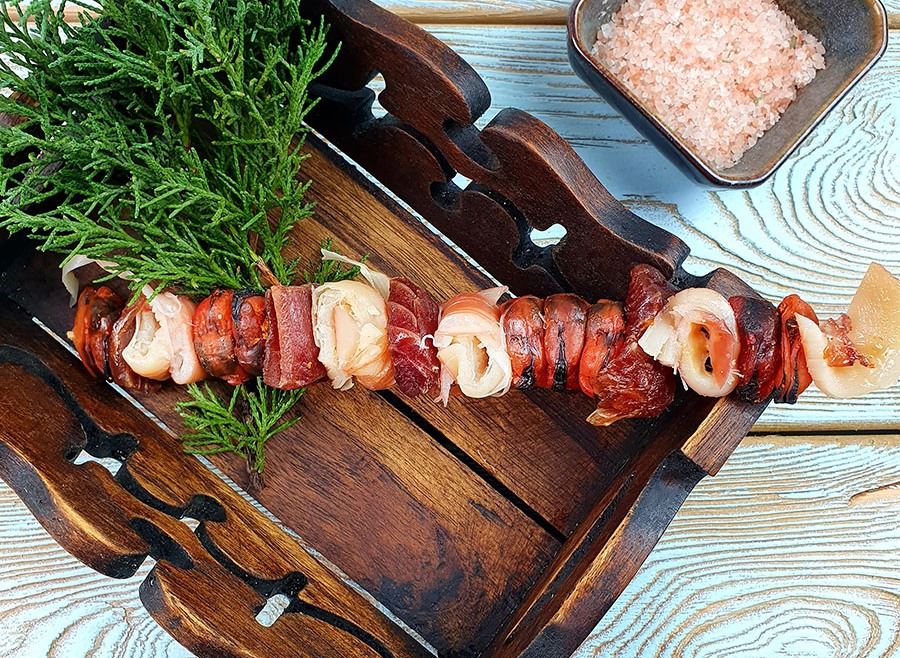 Морской коктейль на шпажке (тунец, кальмар, мидии), сушено-вяленый.